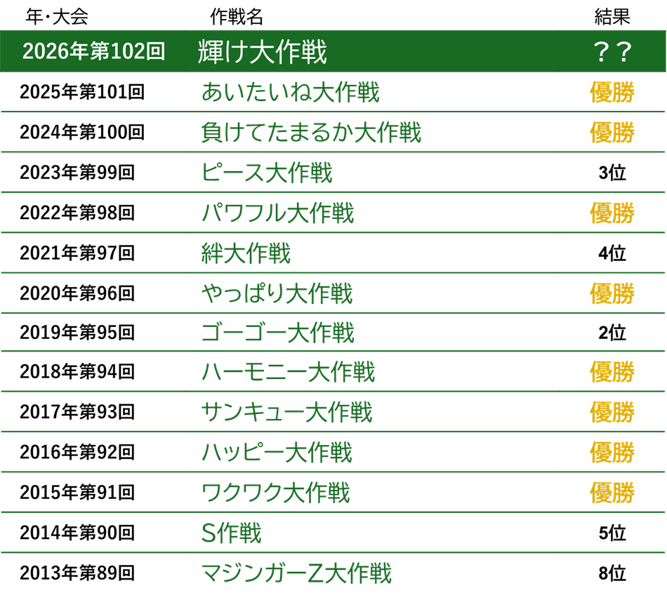 青山学院大学の原晋監督は毎年、箱根駅伝に向けて「○○○○大作戦」と名づけたチームのスローガンを発表している。世相を反映させて世の中の関心を喚起し、選手たちの奮起を促す独特のイメージ戦略、プロモーション戦略として知られる。2013年第89回大会から始まり、2026年第102回大会で14回目となる。今回は「ひとり一人が1番星になって輝いて、大手町に帰ってきてほしい」という願いを込め、「輝け大作戦」として、3連覇を果たす意気込みを示した。