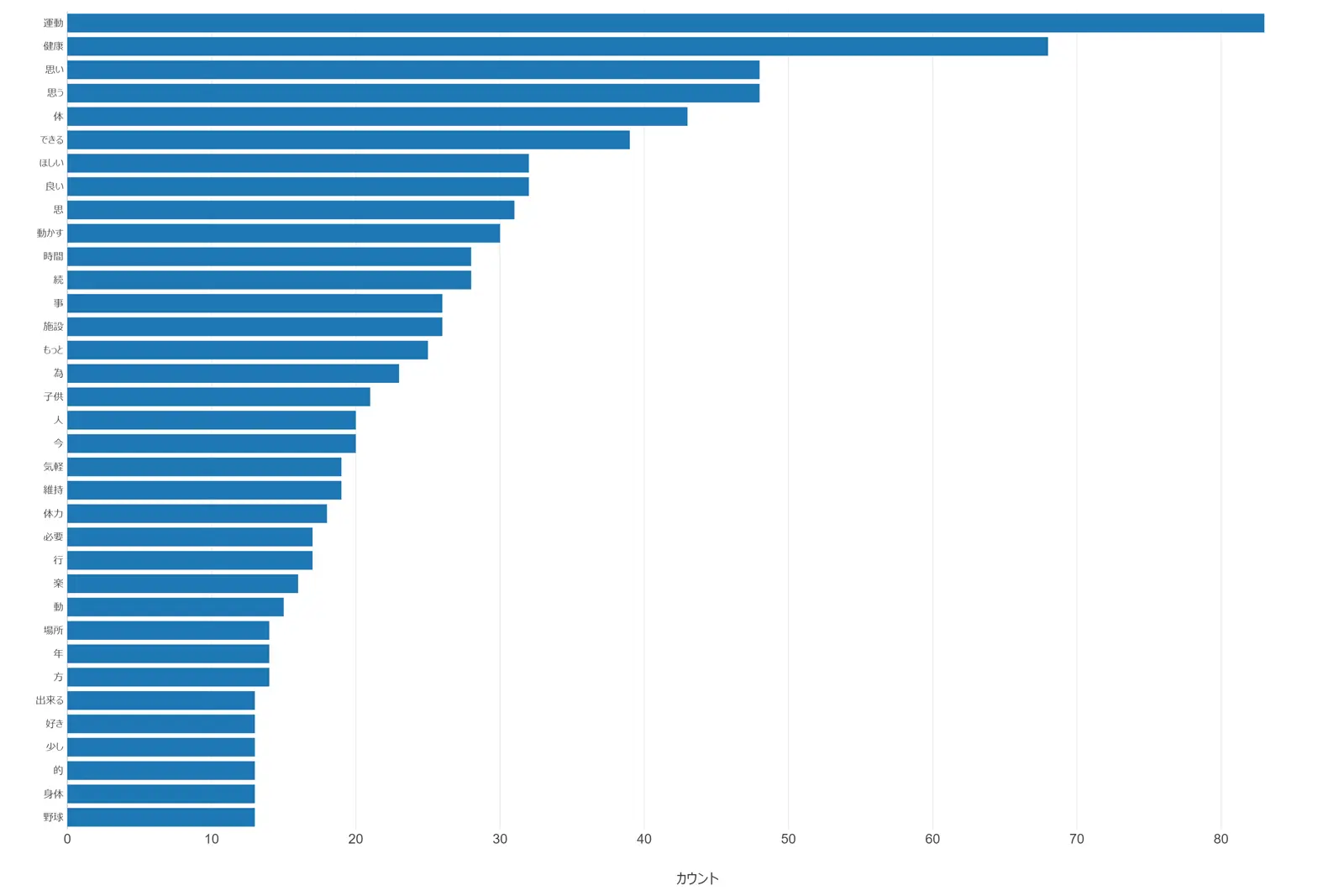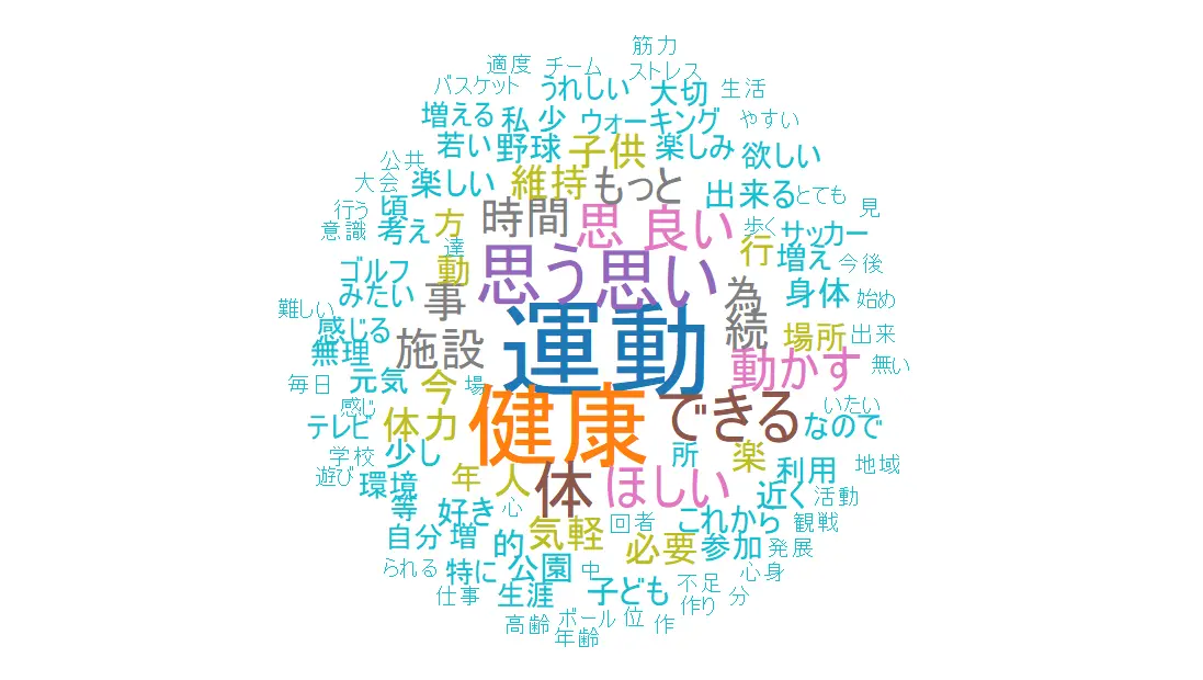 この分布は、第一層(核)に「運動―健康―身体」、第二層(条件)に「できる―時間―施設―もっと/ほしい」、第三層(価値・態度)に「良い―気軽―楽しい―必要」が位置する階層構造を示唆する。さらに「子供」「人」「場所」が、スポーツを社会的・環境的に位置づける補助的語彙として出現している。ここから次の解釈が可能である。