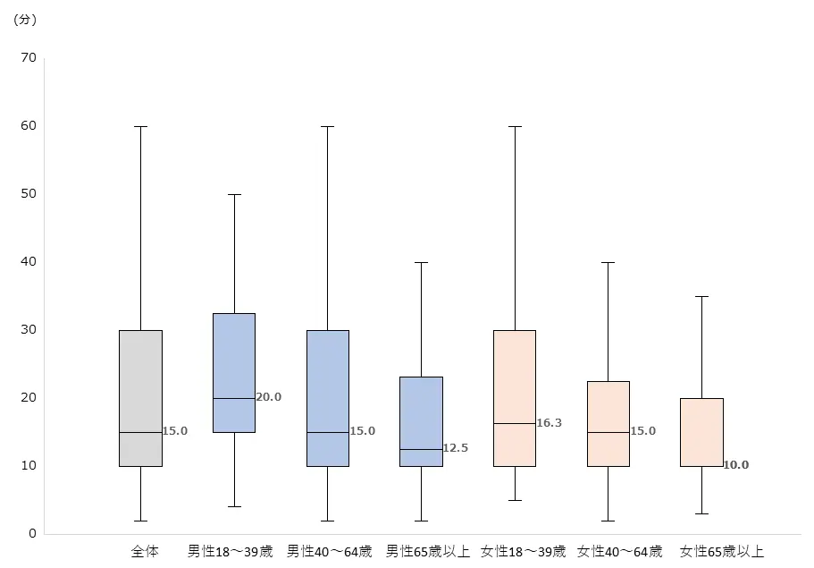 図2に、自宅運動1回あたりの実施時間を性・年代別に示した。全体の実施時間の中央値は15.0分であった。若年層でより1回あたりの実施時間が長い傾向がみられたものの、全体的におよそ10~20分程度での実施が多かった。